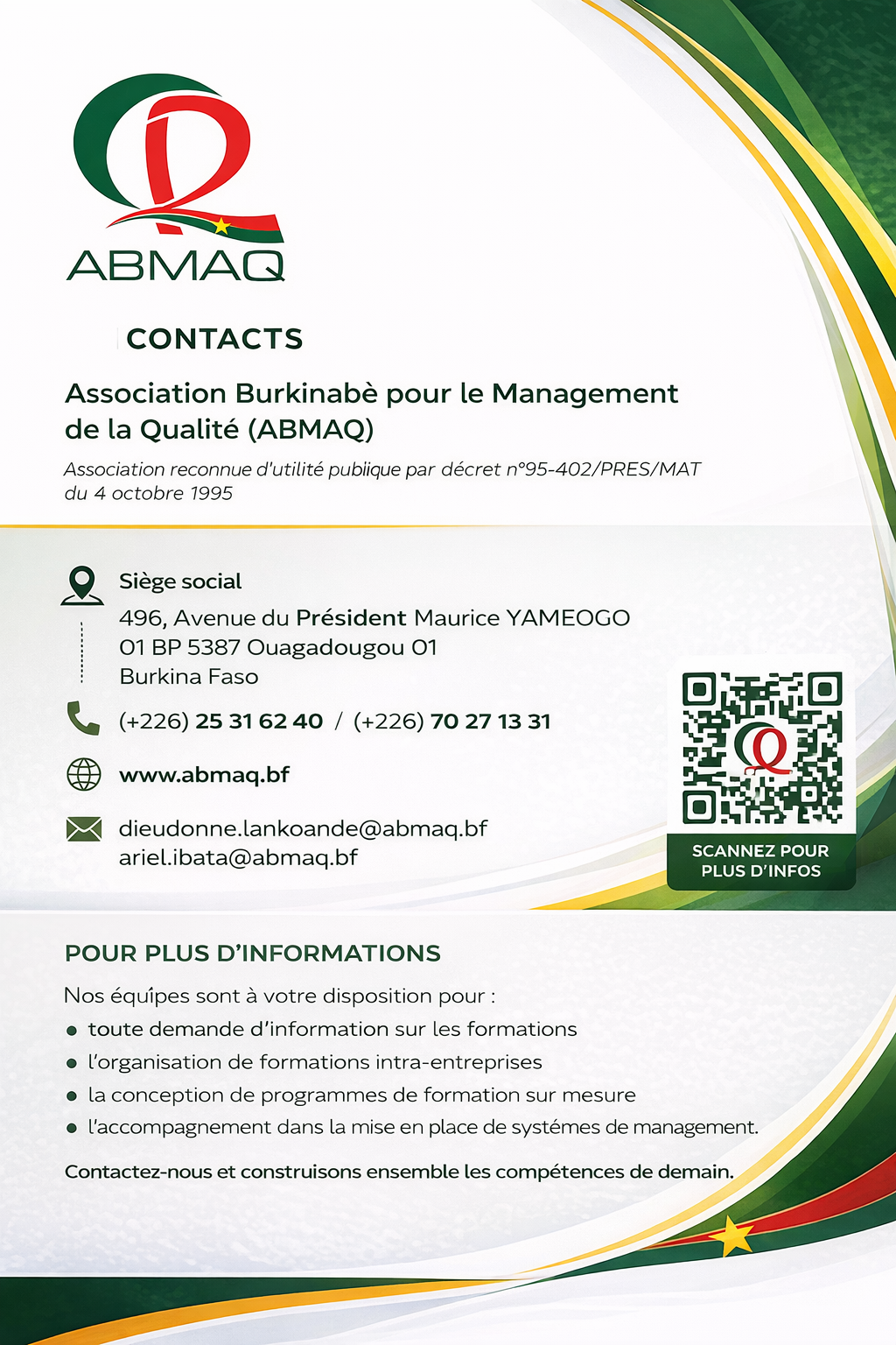 Depuis sa création, l’Association Burkinabè pour le Management de la Qualité (ABMAQ) œuvre à la promotion de la culture qualité et à l’amélioration continue des organisations au Burkina Faso et dans la sous-région. Forte de son expertise et de son réseau de professionnels expérimentés, l’ABMAQ accompagne les entreprises, les administrations publiques et les organisations dans le développement de compétences stratégiques et la mise en place de systèmes de management performants.